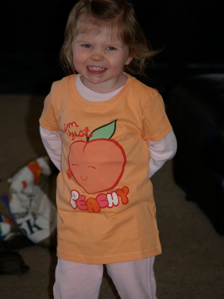 While walking into Old Navy last week, I spotted an orange kids shirt that said, "I just Peachy". SOLD! Didn't care about the size or cost, my Peachy was going to have it.